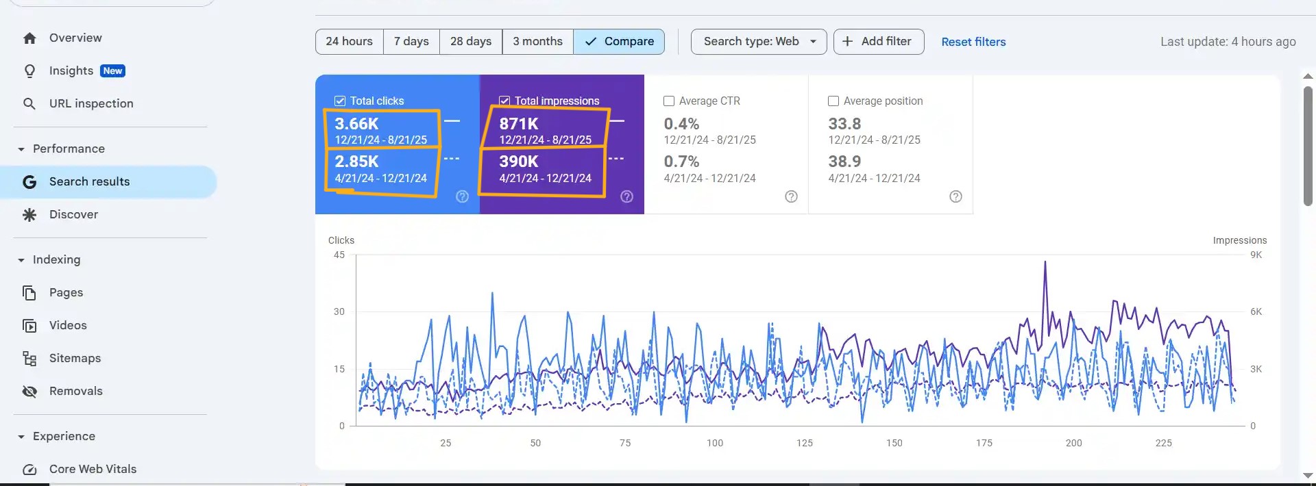 Clicks increased (2.85K → 3.66K) Impressions (390K → 871K).